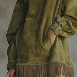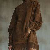 Abito dolcevita in finta pelle scamosciata con orlo sfrangiato